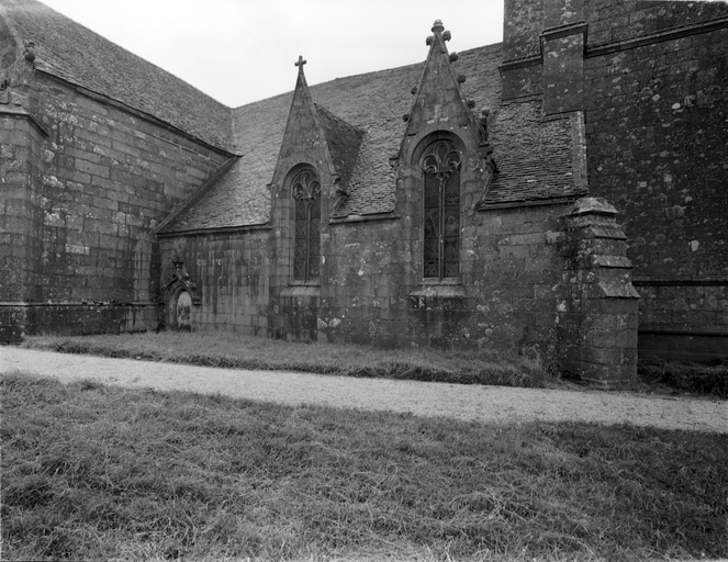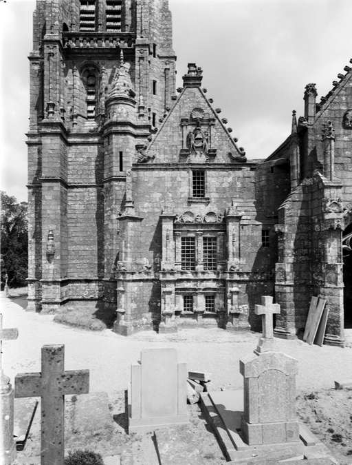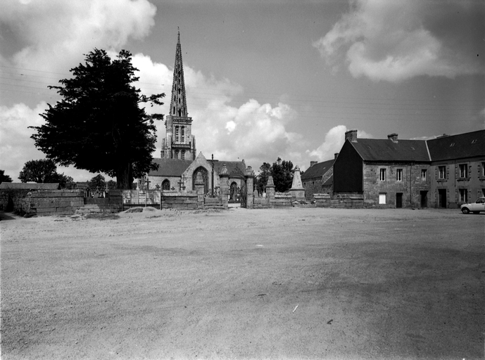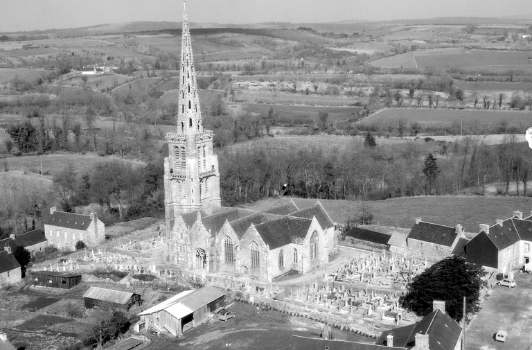 Edifice du 14e siècle ; reconstruit presque totalement au 15e siècle ; ossuaire détruit et porche du début 16e siècle ; inscription : tour commencée en 1530 par Jehannou et Cozic ; secrétairerie en 1552 par Fouquet Jehannou, Cozic et Daniel ; fenêtres nord et sud du chevet percées en 1759 ; nouvelle flèche en 1865 ; dans le porche : armes de Jean de Rohan et d' Isabeau de la Chapelle, duchesse de Molac.