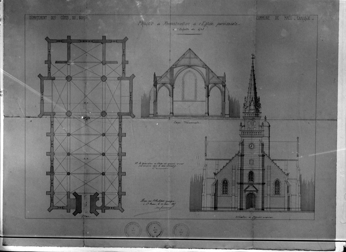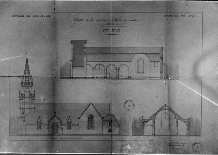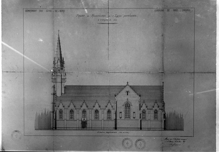 Edifice limite 15e siècle 16e siècle ; reconstruit en 1630 ; tour datée 1760 ; en 1837, construction du bas-côté sud et du porche ; en 1888, 1894 reconstruction presque totale sur des plans de Le Guerranic avec remploi de pierres de l' église et de la chapelle de la Trinité en ruine.