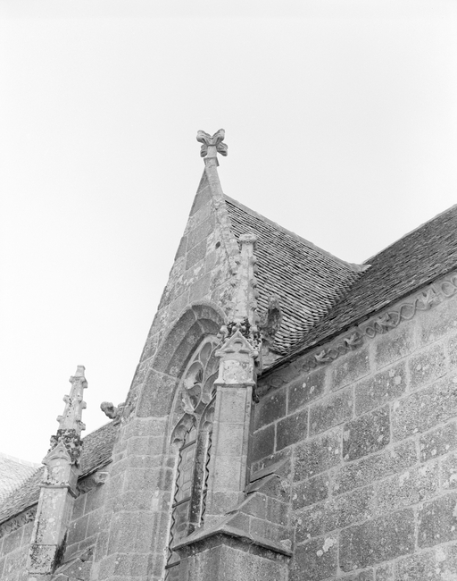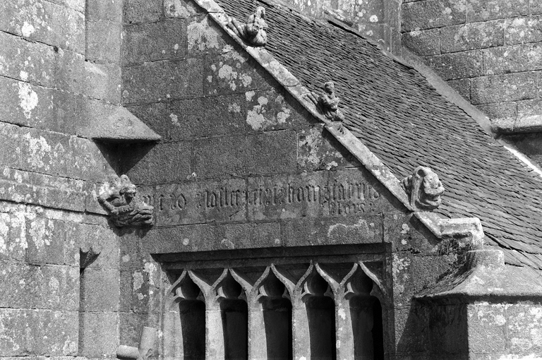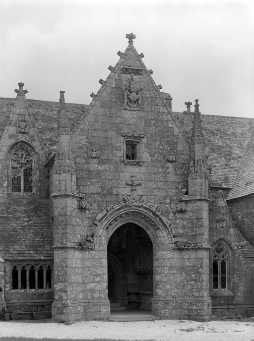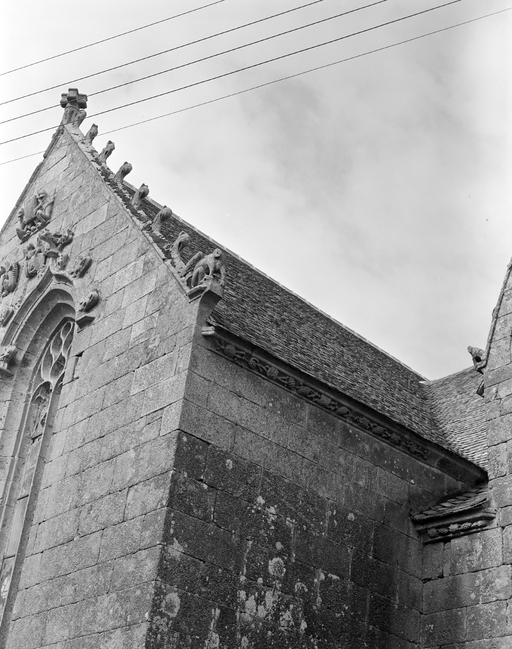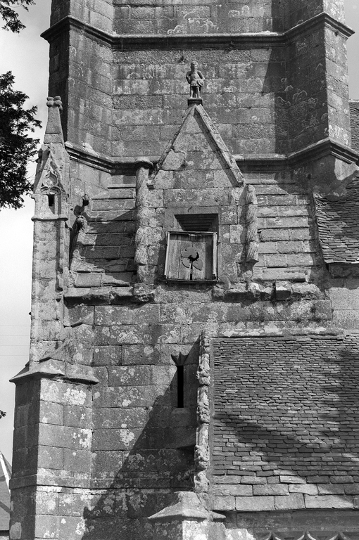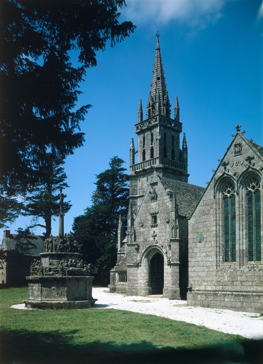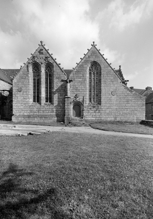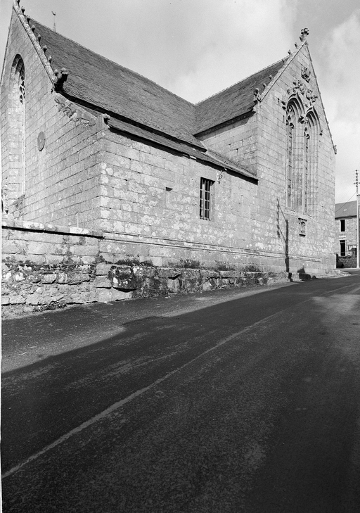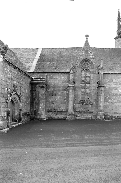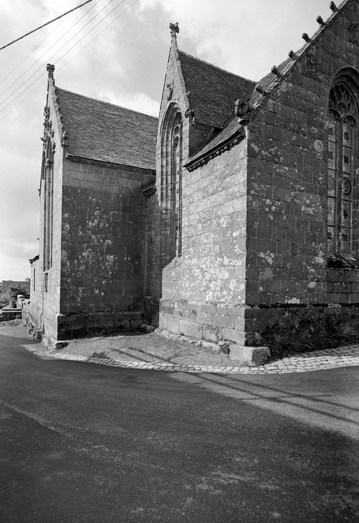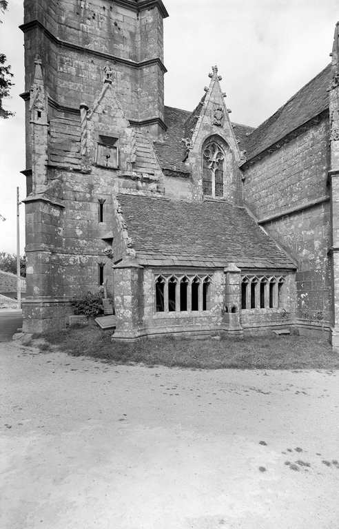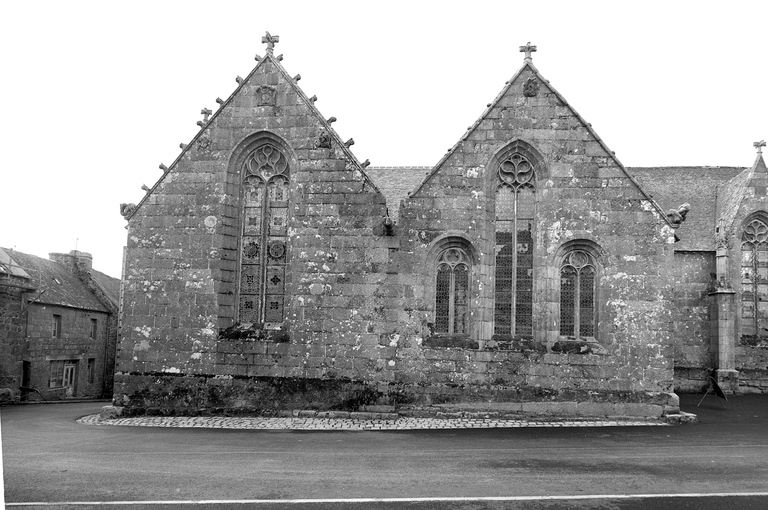 Eglise construite de 1550 (partie est) à 1554 (tour) par Pierre et Guillaume Jézéquel pour Richard Paul, C. Lostec et F. Borgne ; chapelle sud porte la date 1550 ; tour porte la date 1554.
