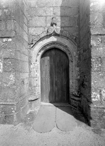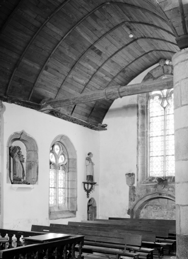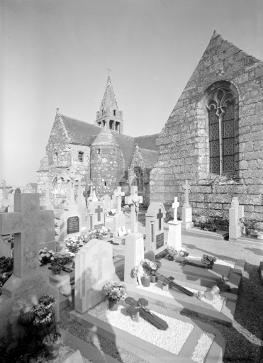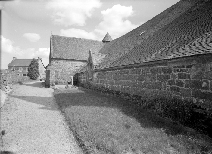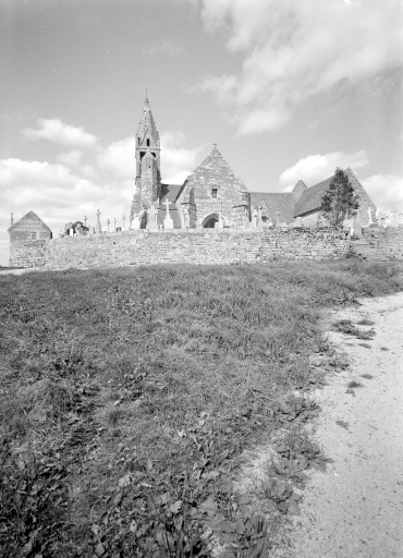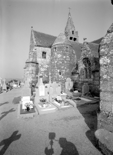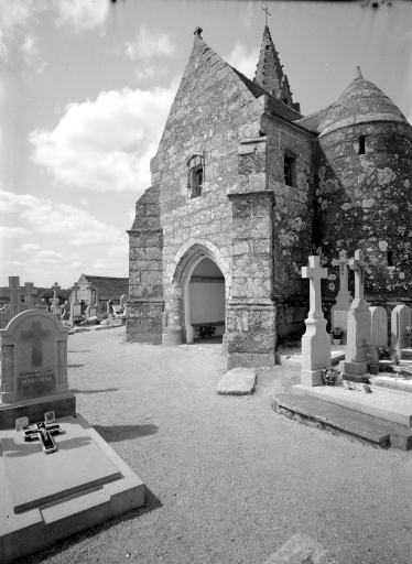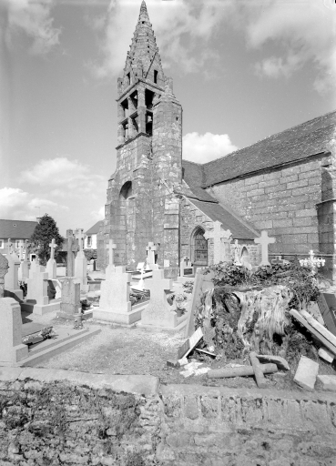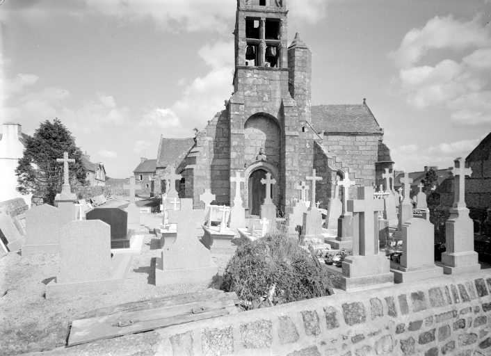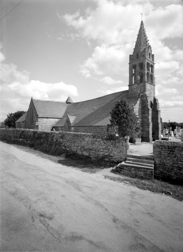 Nef, choeur et transept construits dans la 1ère moitié du 16e siècle, sablières sculptées ; reconstruction du clocher porche ouest dans la 1ère moitié du 17e siècle ; sacristie construite en 1880 ; fonts baptismaux construits en 1886 ; croix monumentale par Larhantec en 1869 ; ossuaire construit dans la 1ère moitié du 16e siècle ?