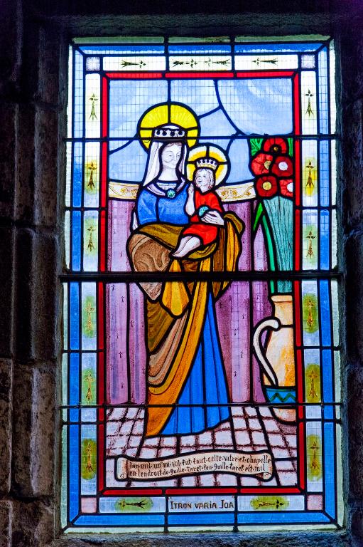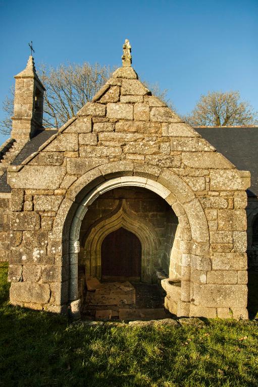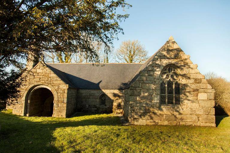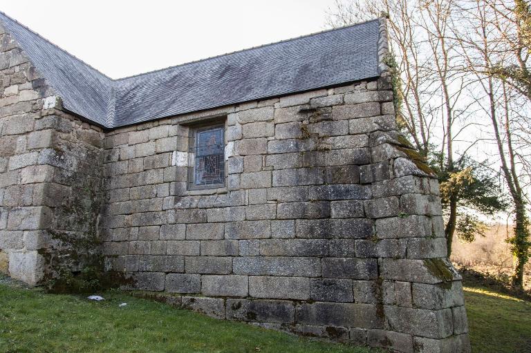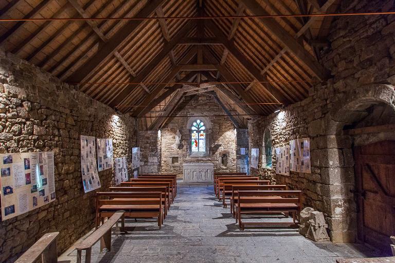À l’intérieur, quelques éléments antérieurs aux reconstructions récentes sont encore perceptibles : posés contre le piédroit du portail méridional, les fragments d’un pinacle fleuronné et d’une colonne, rappelant le gothique renaissant breton, à l’angle sud-est du bras de transept sud, un fragment de remplage gothique, et contre le maitre-autel, un tronçon de colonne octogonale. L’entrée de la chapelle sud, formant transept, est marquée de colonnes engagées semi-octogonales à chapiteaux moulurés en cavet et soulignés d’un astragale torique. Les crédences trilobées du chevet et des transepts indiquent une mise en œuvre des XIVes et XVes siècles. Enfin, à la croisée du transept, une dalle funéraire aux écus frustres prend place devant l’autel. À noter, les inscriptions des vitraux contemporains qui reprennent ceux des anciennes verrières de la chapelle : la maitresse-vitre présentent les écus de Malte, des Rostrenen et des Quelen, et sur la baie rectangulaire du transept nord, on peut voir un phylactère reprenant l’inscription de 1496 décrite par Sigismond Ropartz en 1862.