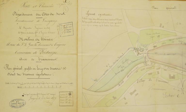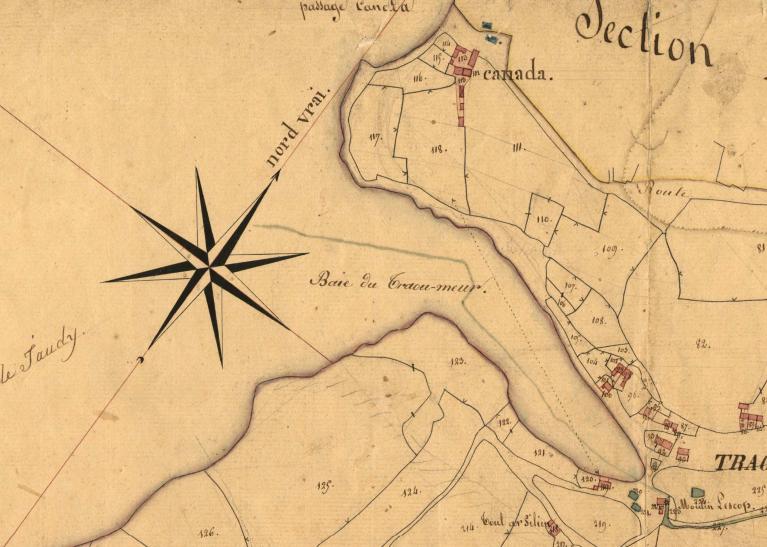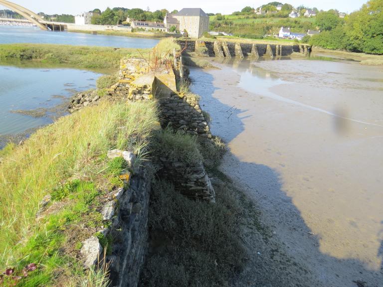 La digue sera formée de 2 murs parallèles en maçonnerie de mortier hydraulique et remplie en son milieu de marne grasse. Elle aura 120 mètres de long sur 10.80 mètres de large et sera ancrée dans les rives de l’anse. Elle sera arasée 90 centimètres sous les plus hautes mers d’équinoxe et aura une hauteur maximale de 7.50 mètres. Nota : aux grandes marées, la roue du moulin Barzic et la route sont sous l’eau...