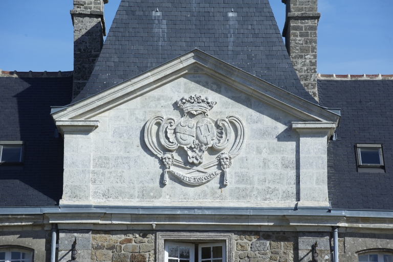 Sur le tympan central, façade sud : blason de la famille de Caradeuc accolé à celui des Martel. Devise des Caradeuc : Arreste ton coeur. (mariage avec Emilie Martel en 1821). Façade nord : armes de Caradeuc et Raille de la Fresnais.