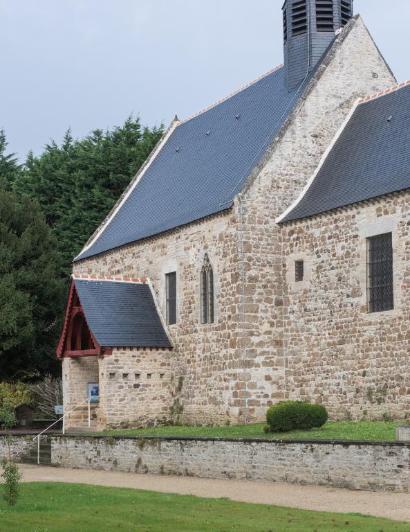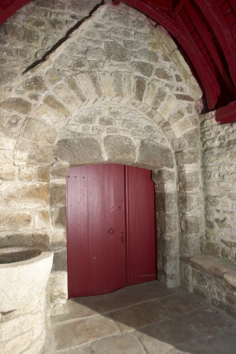 Le porche sud Au dessus de la porte donnant accès à la nef, incontestablement romane, un larmier ancien, atteste, comme à Saint-André-des-Eaux qu´un porche de dimensions plus réduites existait dès l´époque romane Le porche actuel remonte probablement au 15e siècle, comme l´indique sa charpente à chevrons fermes et entrait chanfreinés, d´un modèle semblable à celle qui couvre la nef. Les cinq trous de boulins parfaitement alignés visibles à l´extérieur des murs latéraux de même que les deux trous situés à la même hauteur dans la face de ces murs, attestent de l´ancrage de poutrelles constituant de part et d´autre un appentis reposant sur des poteaux de bois et abrité par les prolongements du toit principal. Dans les sablières intérieures du porche, deux mortaises, en vis-à-vis l´une de l´autre devaient servir à bloquer une poutrelle transversale permettant l´installation d´un plancher isolant la partie supérieure du porche. Cette disposition ancienne explique en outre que la face supérieure de l´entrait qui traverse l´ouverture du porche, n´est pas chanfreinée puisque ce dernier servait de poutre pour recevoir le plancher. L´existence en Haute Bretagne de plusieurs porches des 16e et 17e siècle, dont la partie supérieure servait d´ossuaire, permet d´envisager cette hypothèse, confirmée par la tradition locale.