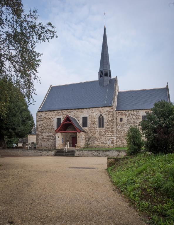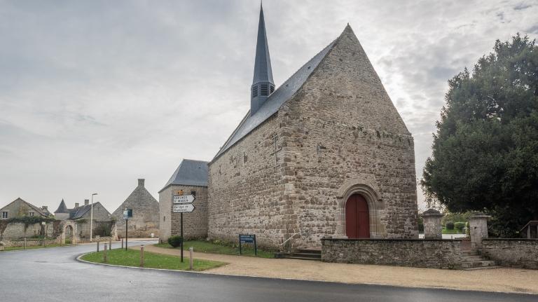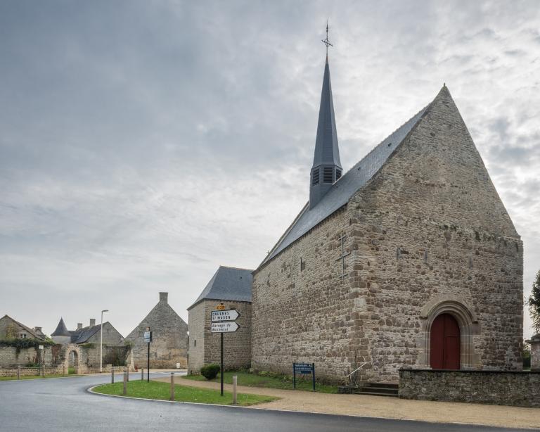 Eglise du 11e siècle dont le volume initial est entièrement conservé. Plusieurs modifications au 14e siècle dont : percement d´une baie à deux lancettes à l´extrémité du mur sud de la nef, ouverture d´une arcade dans la partie supérieure du mur nord du choeur, lors de la création d´une chapelle seigneuriale en étage, probablement pour la famille de Coêtquen, seigneurs de Rouget et de la Rivière. On peut attribuer au 15e siècle le percement ou le renouvellement du portail occidental, la reconstruction du porche sud ainsi que la réfection de la charpente de l´ensemble de l´église avec une pente plus forte. Une nouvelle sacristie est reconstruite en 1660, contre le mur nord du choeur à l´emplacement de l´ancienne ; une grande fenêtre rectangulaire est probablement ouverte dans le choeur à la même époque. Des travaux de restauration à la façade sud en 1866 entraînent le percement de nouvelles baies, rectangulaires dont les linteaux sont surmontés de plates-bandes clavées formant arc de décharge. En même temps l´installation d´une vaste tribune en bois au bas de la nef permet d´augmenter la capacité d´accueil de l´église devenue trop petite. Une seconde campagne de restauration vers 1950 s´est traduite par l´enlèvement des enduits intérieurs. De cette période date également le rétrécissement de l'enclos paroissial qui conserve toutefois encore son ancienne croix de cimetière, de tradition médiévale, en granite monolithique. L´édifice est inscrit à l´inventaire supplémentaire des monuments historiques depuis 1964.