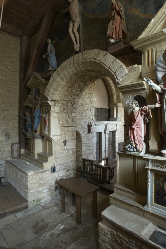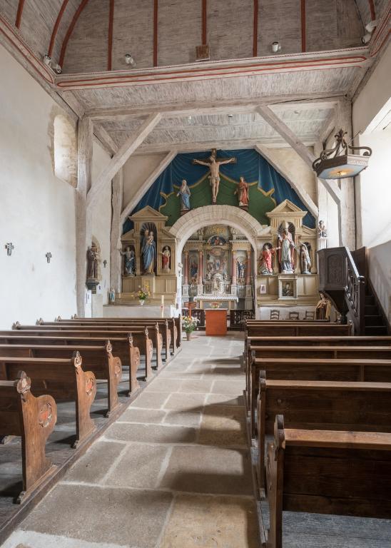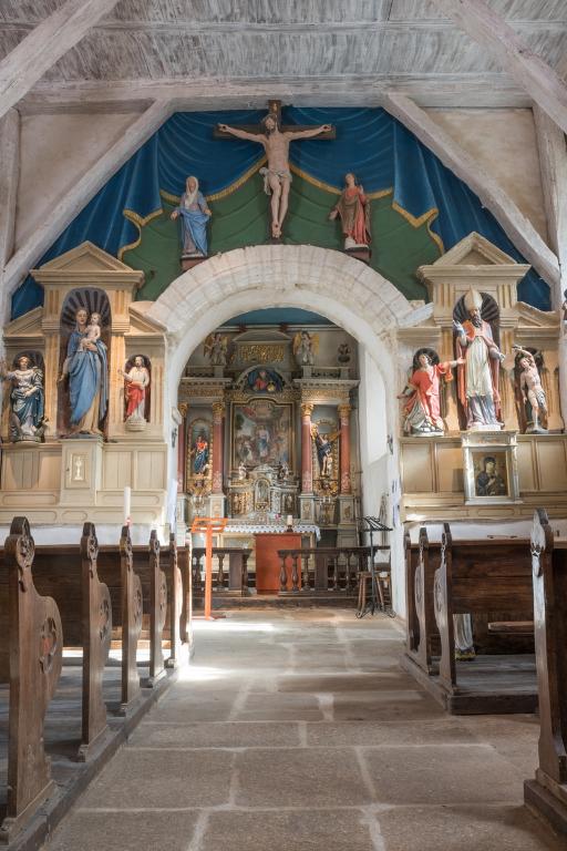 L´intérieur L´ancrage du clocher de charpente par de grands poteaux, à la rencontre de la nef et du choeur est un principe que l´on retrouve dans plusieurs églises anciennes remontant à l´époque romane, comme celles de Vendel en Ille-et-Vilaine où ce dispositif est probablement contemporain de la charpente, du 14e siècle, elle-même entièrement portée sur des poteaux de bois. Cette disposition qui se retrouve également à Saint-Lunaire, existait encore dans l´église de Morieux en Côtes d´Armor, avant la restauration récente de l´édifice. (cf. Roger Grand) . La reprise de l´arc diaphragme du côté de la nef se rattache probablement aux importants travaux du 17e siècle. La large moulure du voussoir ajouté vient en se rétrécissant à la rencontre des ailes des retables latéraux en pierre est sans doute directement liée à leur installation en même temps qu´à celle du groupe de la crucifixion au 17e siècle.