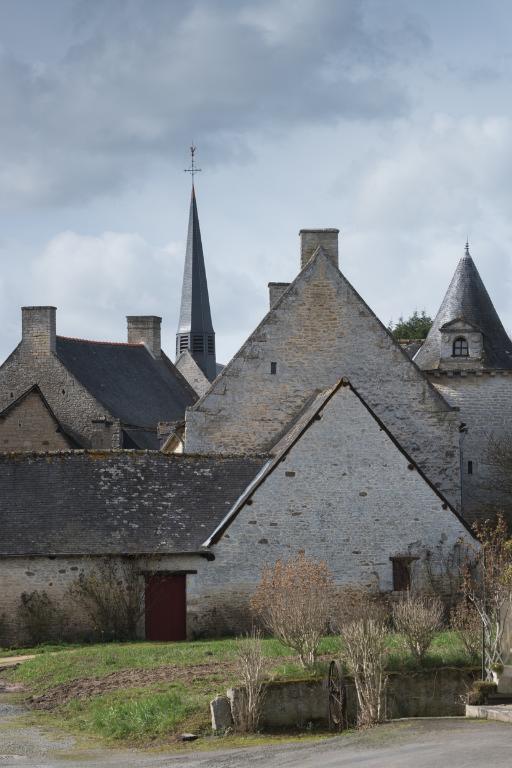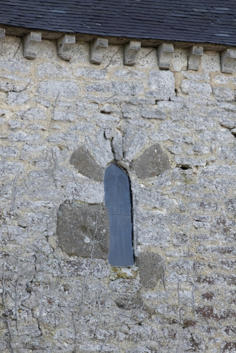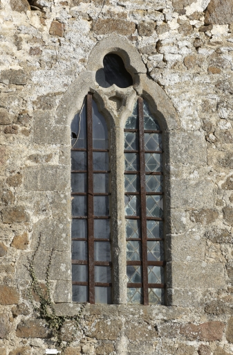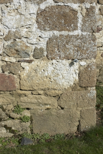 Les matériaux de construction et les élévations L´église est essentiellement construite dans deux matériaux : un granite brun doré, à cassure irrégulière, semblable à celui que l´on rencontre à Guitté et Guenroc, et la pierre locale, le calcaire coquillier des faluns, associés de manière différente selon les parties de l´édifice. L´ensemble de la nef repose sur une assise en calcaire coquillier ; la côtière nord présente jusqu´au tiers de sa hauteur, des bandes de plusieurs lits de calcaire alternant avec des assises de granite, immédiatement surmontées d´une portion en granite et pour la partie supérieure une majorité de calcaire comportant quelques pierres de granites éparses, trace indéniable, avec les proportions écourtées des baies, d´un remontage ultérieur. Les lits alternés en petit appareil de calcaire et de granite très visibles dans la portion ouest du mur sud, sont remplacés à l´est du porche par un appareil en majorité de granite, en partie bouleversé par la création de fenêtres rectangles au 19e siècle. Enfin, curieusement, on ne retrouve pas sur le parement intérieur des murs, entièrement en calcaire, la mixité mise en oeuvre pour l´extérieur. Les parties d´élévation conservées dans leur état originel se remarquent par leur petit appareil de moellons réglés et assisés. La surélévation des trois pignons, bien visible, correspond au renouvellement de la charpente de l´église au 15e siècle, avec la sacristie rebâtie en 1660 elle a été entièrement réalisée en calcaire des Faluns. La fenêtre à lancettes du 14e siècle percée dans la partie est de la nef de même que la très petite baie carrée visible dan la partie haute du mur sud du choeur se distinguent par l´emploi d´un granite à grain fin semblable à celui de Languédias.