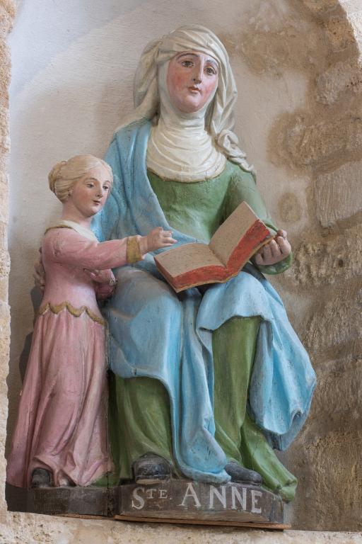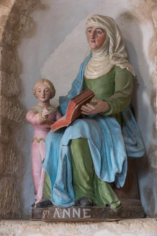 A mentionner encore parmi les nombreuses statues polychrome, une éducation de la Vierge du 16e siècle et des dalles funéraires du 15e siècle dont celle de la famille Hingant du Hac, actuellement adossée à l´ancienne porte nord ainsi qu´une dalle en haut de la nef retaillée à l´époque moderne en forme d´écu figurant en bannière les armes en alliance des familles de Coëtquen et de Beaumanoir.