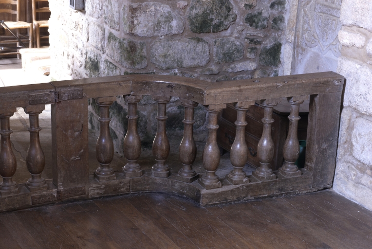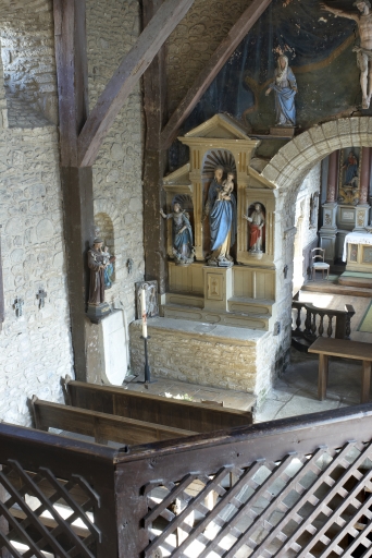 La sacristie et la chapelle seigneuriale La porte de la sacristie, flanquée de pilastres conformes à la date de 1660 inscrite sur son linteau, est surmontée de pinacles écrêtés qui semblent des remplois gothiques. La porte de gauche, très simple, ouvrait sur un escalier dérobé en vis en bois conduisant à la tribune au-dessus. L´arcade en tiers point qui ouvre celle-ci sur le choeur est évidemment nettement antérieure à la (re) construction de 1660. Sa mouluration à larges redents ourlés de cavets, de même que les tailloirs qui lui tiennent lieu de chapiteaux la situent dans la seconde moitié du 14e siècle. Son appellation de « tribune des chantres » reflète sans doute un usage assez tardif. Il s´agit en fait d´une tribune seigneuriale, réservée à une famille de rang important. Cette disposition remarquable dont on connaît en Bretagne quelques autres exemples comme celles de l´église Saint-Armel de Ploërmel, de l´ancienne collégiale de Champeaux, ou encore des églises de Visseiche et de Villamée, est sans doute à mettre en relation avec les familles de Lanvallay et de Coëtquen qui détiennent aux 14e et 15e siècle la seigneurie du Rouget à la limite de Tréfumel et de Saint-Juvat, ainsi que celle de la Rivière au sud ouest de l´église. Le garde corps de menuiserie replacé de façon impropre au revers de l´arcade devait reposer sur la corniche qui règne au dessus des deux portes. La mise en oeuvre de ses panneaux signale une réalisation du 17e siècle contemporaine de la reconstruction de la sacristie. Sa partie supérieure constituée d´une claire voie en treillis de bois, permettant de voir l´office en toute confidentialité.