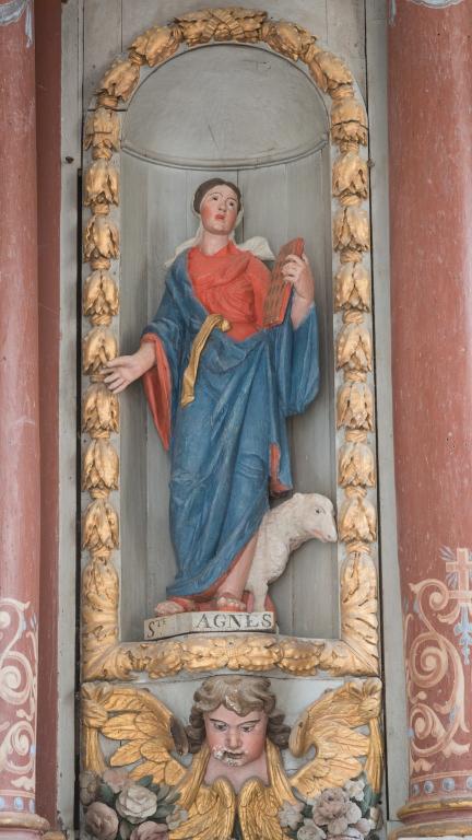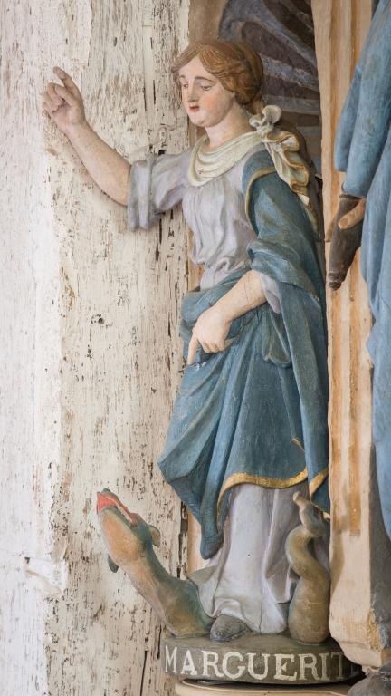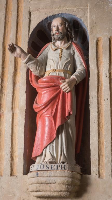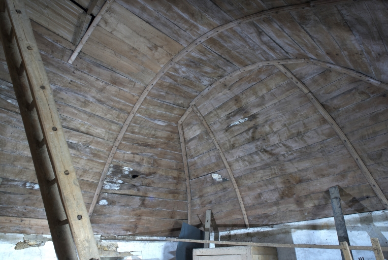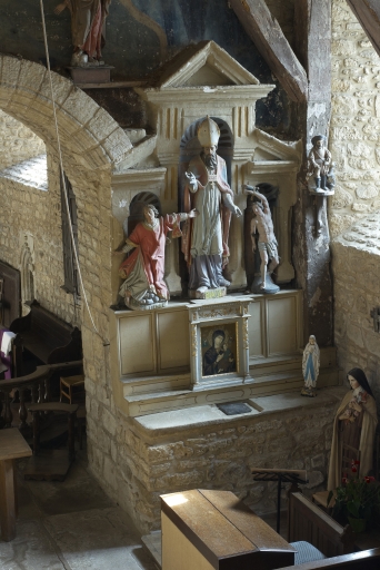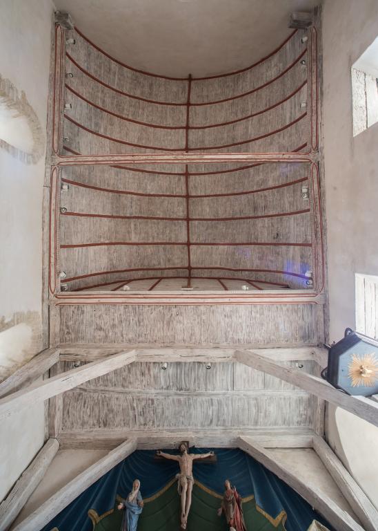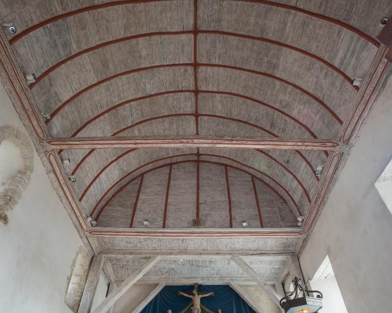 La charpente La nef de l´église est surmontée d´une charpente lambrissée tandis que le choeur est couvert par un plafond en planches peint en ciel étoilé, peut-être installé au début du 18e siècle, en même temps que le retable du maître-autel. La charpente de la nef, à chevrons-fermes porte un lambris cloué dont les raccords sont masqués par des couvres joints eux-mêmes cloués. Le profil en plein-cintre de cette charpente, la mouluration relativement sommaire des couvre-joints ainsi que les clefs pendantes en forme de balustre qui rythment le sous-faitage correspondent à une date de refection de la fin du XVIe ou du début du XVIIe siècle. Dans la partie qui correspond au clocher, la sous-face des chevrons de cette charpente qui ne présente aucune trace de clou atteste que la construction du beffroi et la charpente de la nef son contemporaines.