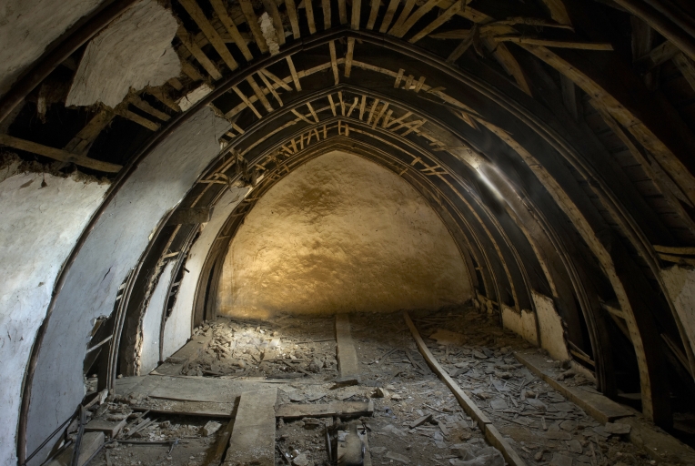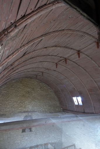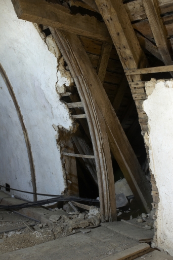 La charpente du chœur masquée par le plafond décrit plus haut, n´est accessible que depuis l´étage de la sacristie. Elle a conservé l´ensemble de sa structure à chevrons-fermes en forme d´arc brisé. Une ferme sur deux est moulurée avec soin, en plein bois, d´un tore principal séparé par des gorges de deux autres tores plus petits. Cette charpente est aujourd´hui habillée d´un hourdis de terre ruiné, armé de lattes engagées dans des rainures pratiquées dans la section des fermes moulurées. Ce hourdis qui vient en grande partie masquer l´élégante mouluration de cette charpente n´est pas d´origine mais résulte d´une remise en état sommaire qui pourrait dater du 17e siècle. Il est certain en revanche que le raffinement de cette charpente correspondait à un lambris encastré, pratique employée au 14e et 15e siècle pour les ouvrages les plus soignés.