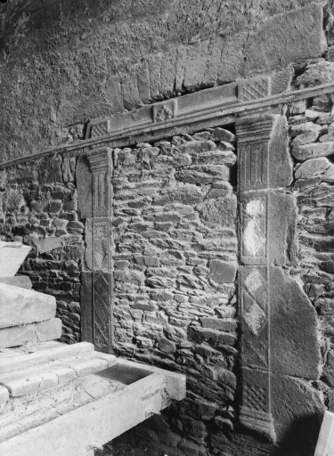 A l'intérieur et articulation des pièces : le manoir s'articule symétriquement de part et d'autre d'un escalier à l'italienne à quatre volées et quatre paliers, sur lequel se greffe une tourelle légèrement en encorbellement abritant un escalier à vis, en grès, qui se termine par une vis en bois donnant accès aux combles en poivrière aujourd'hui disparu. L'accès à l'escalier se fait par un passage couvert donnant sur deux portes jumelles en tiers-point, dont l'appareil se raccorde à l'angle du mur, à celui de la porte de l'escalier, est aujourd'hui bouchée. En vis-à-vis remontage (?) d'une porte à pilastres et linteau à décor géométrique : cercles et losanges (17e siècle). La porte d'accès à l'escalier est en bois (17e siècle ?). Au rez-de-chaussée 3 cheminées monumentales du 16e siècle. A l'étage, au niveau du 3e palier, s'ouvre une porte à anse de panier donnant à l'ouest sur un appentis. Un siège d'aisance, en grès, y occupe l'angle nord-ouest dans l'épaisseur du mur et le conduit descend jusqu'à la cave. Sur cet appentis ouvre la seule pièce du manoir qui a conservé sa charpente à entraits retroussés et jambe de force en plein cintre à clés pendantes et corbelets sculptés. La cheminée en schiste, à linteau oblique et corniche a conservé les armoiries en partie polychrome (lions rouges). Au niveau du 4e palier : balustrade en bois, 16e siècle, s'ouvrent deux portes géminées en anse de panier. Le trumeau est décoré au niveau de l'écoinçon par un médaillon semblable à celui de la lucarne. La pièce située à l'Est conserve un vestige de panneau de lambris du 18e siècle. Description intérieur du manoir annexe : pièce unique au rez-de-chaussée, au fond, mur nord, trois portes géminées, celle de droit est bouchée, celle de gauche ouvre sur une petite pièce avec cheminée d'angle. La porte du centre donne accès à l'escalier à vis. Au pied de l'escalier, une petite porte ouvre sur un réduit contenant une auge et des loges. Le palier ouvre par trois portes sur trois pièces, dont une grande avec cheminée : consoles à décor végétal et volutes reposant sur piédroit en forme d'obélisque renversé.