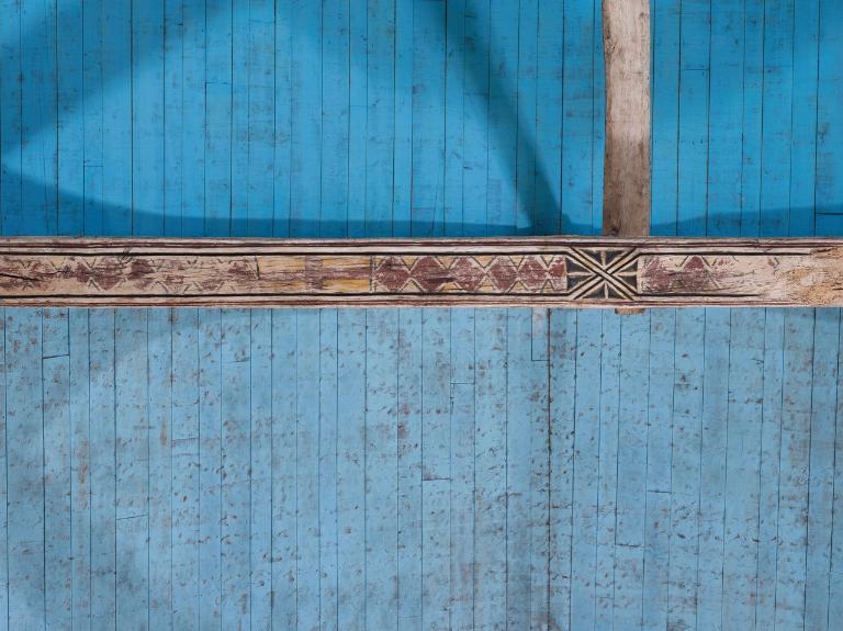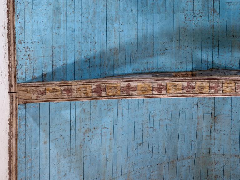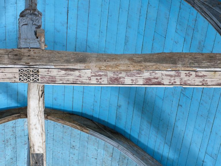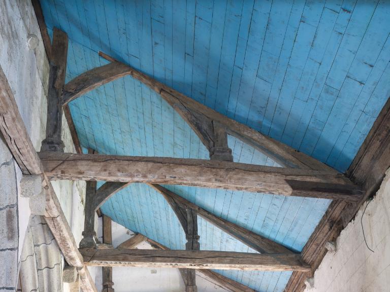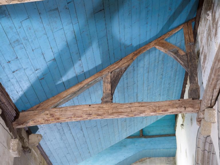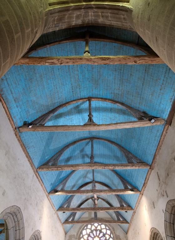 Si le lambris a été à plusieurs reprises remplacé, et selon des profils différents (son dernier état remonte à 1974-1980), la charpente à fermes et pannes conserve encore l´essentiel de sa structure du début du 15e siècle et s´inscrit à ce titre dans une rare série de charpentes bretonnes des années 1400, aussi bien religieuses que civiles. Dans le vaisseau central, elle est constituée de six fermes disposées suivant un rythme régulier, indépendant de celui des grandes arcades. Chacune comprend un entrait mouluré ou chanfreiné, deux arbalétriers à jambettes courbes, un poinçon long également mouluré et parfois orné à la base. La charpente des bas-côtés était conçue sur le même principe : des demi-fermes composées d´un demi-entrait avec potelet médian, d´un poinçon sculpté et d´un arbalétrier soulagé par des liens courbes. La disposition d´origine est conservée au midi, où les entraits prennent appui, du côté du vaisseau central, sur une sablière reposant sur des corbeaux de pierre disposés de biais. Cette structure était conçue pour contrebuter le vaisseau central. Les sous-faces des pièces de charpente portent des décors peints géométriques (damiers, croix, cercles, triangles, quintefeuilles), mais ces traces de polychromie ne se limitent pas aux entraits, arbalétriers et jambettes, elles apparaissent aussi sur la corniche moulurée d´origine, dissimulée par le lambris actuel, et sous les pannes et les liens du faîtage, ce qui suggérerait que la totalité de la charpente ait pu être à l´origine apparente. Cependant, des traces de fixation permettent de restituer un lambris cloué en sous-face des chevrons, suivant le rampant de la toiture.
