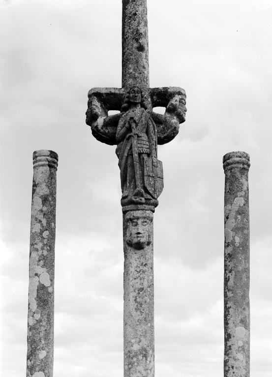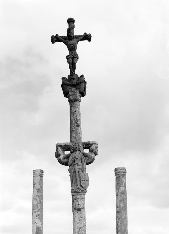 Calvaire 16e siècle ; remanié au 19e siècle : soubassement et Christ ; statues disparues : larrons, Vierge, saint Jean et Christ du 16e siècle.