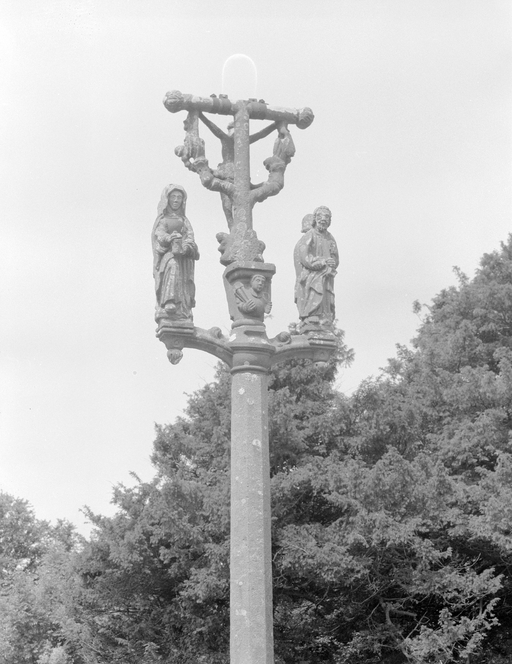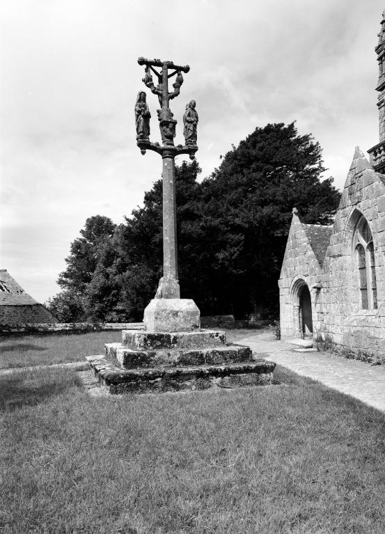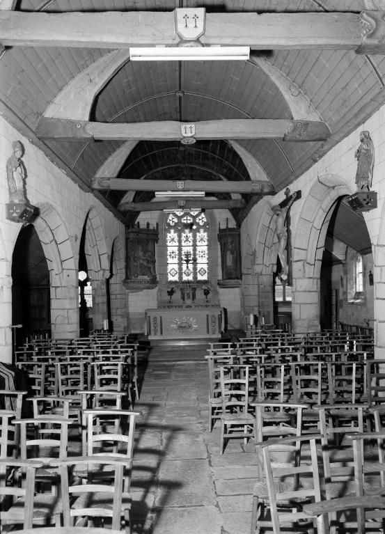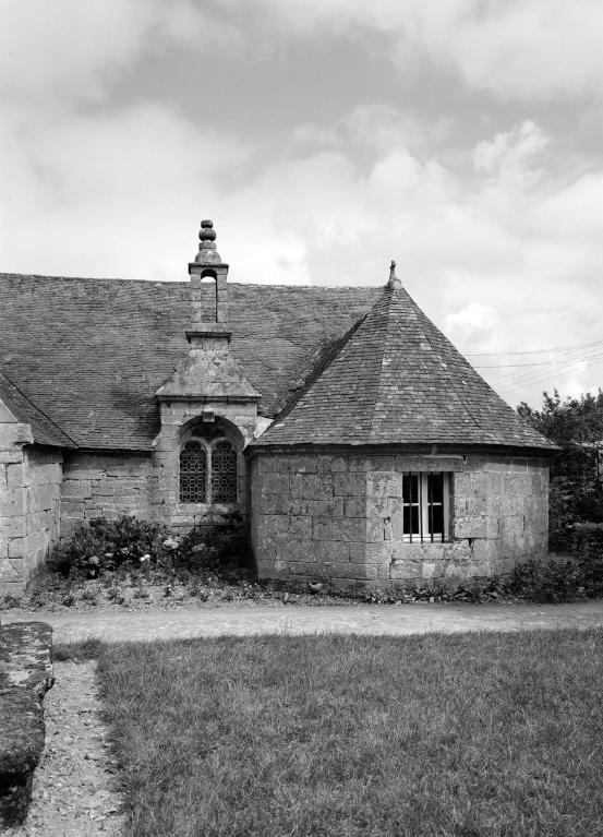 Eglise construite en deux campagnes datées 1547 et 1574 ; sacristie en 1680 ; clocher reconstruit en 1735 ; flèche en 1893 par Abgrall ; inscription de la console né du choeur : MVCCXLVII MARIA MATER GRATIAE TU NOS AB HOSTE PROTEGE ; inscription pile 1N de la nef et portail ouest : 1574 ; inscription sacristie : M G MEN RECTEUR 1680 M MAUGUEN FAB ; calvaire 1ère moitié 17e siècle.