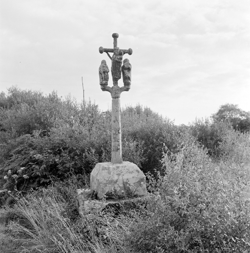 Socle 16e siècle, portant l'inscription : L'AN MIL VCC X.IX (1559 ?) YVON LE GAC, 29 JOUR DAVRIL ; croix et personnages 17e siècle.