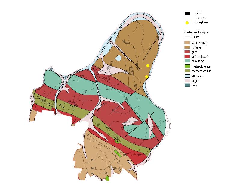 L’emploi massif de schistes bleus, grès et quartzites dans les constructions rurales rendent compte d’un approvisionnement en matériaux principalement local.