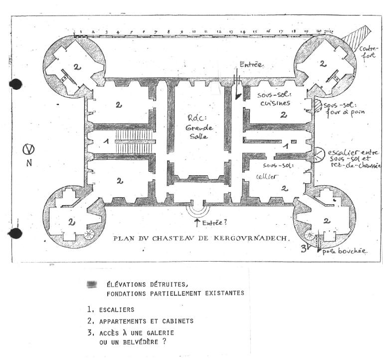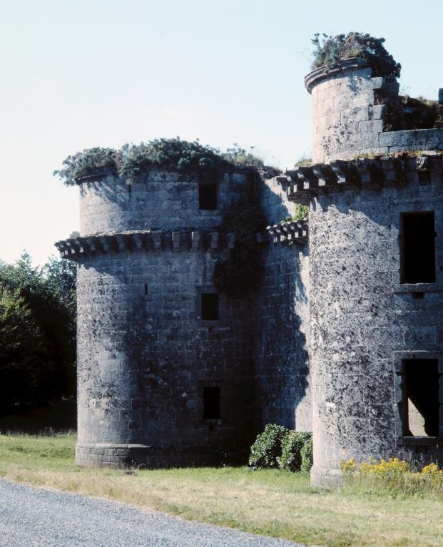 Construit en pierre de taille de granite gris, le logis de plan rectangulaire (d’après le plan de 1644, 18 toises 2 pieds x 10 toises soit 35,5 mètres par 19,5 mètres) est flanqué de quatre tours (5 toises de diamètre soit 9,75 mètres environ).