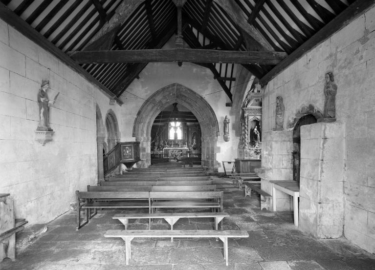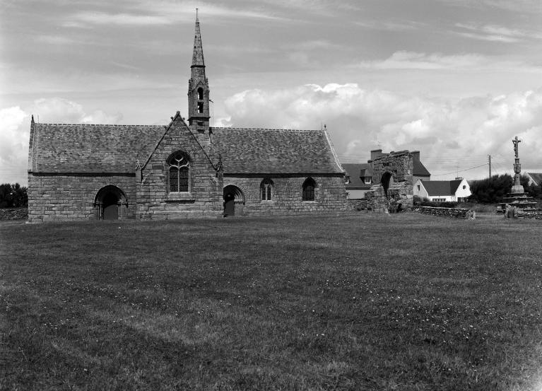 Arcades 13e siècle ; reconstruction à partir du 15e siècle ; chapelles latérales 16e siècle ; clocheton moderne ; calvaire daté 1617, inscription calvaire : IACQVE : LE : BER DE KERGVIDAN FA 1617.