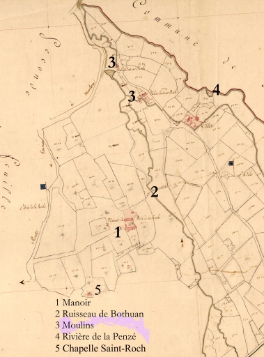 Des traces d´un édifice gallo-romain avec hypocauste ont été découvertes au 19e siècle sur le site. Des vestiges d´une muraille, peut-être médiévale, ferment le jardin d´agrément à l´est ; ils pourraient être contemporains d´un mur de soutènement surplombant en partie un des deux étangs, sans doute un ancien vivier. Le lieu noble de Coat an Roch avec haute, moyenne et basse justice est attesté en 1481 et appartient aux Kermellec, puis en 1540 aux Cornouaille et Kerriec (armoiries remployées). Les Bouvans (armoiries remployées) le possèdent entre le début du 17e et la fin du 18e siècle. Par la suite, il est habité et réaménagé par la famille du Laurens de la Barre et notamment l´écrivain folkloriste Ernest du Laurens de la Barre qui y décède en 1882. Le manoir était le centre d´un important domaine seigneurial qui englobait, outre la métairie située au nord du logis, un vaste territoire vallonné et boisé touchant les contreforts des monts d´Arrée. En faisait également partie un des deux moulins à eau encore en place qui, alimenté par le ruisseau de Bothuan, se jette, non loin de là, dans la rivière de la Penzé. Située entre le manoir et le village de la Garenne, la chapelle dédiée à saint Roch, associée à une fontaine, existait encore au début du 19e siècle. Disparue depuis, son emplacement est actuellement marqué par les vestiges d´une croix. Figurant sur le cadastre de 1812, le colombier, situé à l´ouest du logis, a disparu. Le parc au sud a été aménagé aux 18e et 19e siècles. La chronologie des différents bâtiments s´appuie sur les travaux historiques, le premier plan cadastral (1812) et à l´analyse stylistique et morphologique des éléments encore en place. MANOIR : d´un édifice de la fin 15e siècle subsistent une partie du volume d´origine (plan avec aile sud en retour d´équerre abritant la cuisine, baie quadrilobée remployée, porte d´entrée nord). Certaines modifications ou reconstructions partielles semblent remonter au 16e siècle (cheminées monumentales et accès à un corps de latrines disparu, avec porte transformée en fenêtre sur le pignon ouest de la salle de l´étage). La tour d´escalier d´origine située dans l´angle sud-est et ayant probablement enfermée un escalier monumental en vis, semble encore figurer sur le cadastre de 1812. Le mur de refend séparant l´actuelle entrée de la salle ouest pourrait dater du 17e siècle. Au cours du 19e siècle, l´édifice a été amputé d´environ un tiers de son emprise initiale et la tour d´escalier remplacée par un escalier de distribution extérieur à deux volées droites qui dessert, tout comme un escalier moderne en bois placé dans la salle du rez-de-chaussée, les pièces de l´étage. De nombreuses ouvertures ont alors été percées ou modifiées. Les pierres d´attente sur l´angle nord-ouest pourraient indiquer l´existence d´un petit corps de bâtiment qui, encore marqué sur le cadastre de 1812, a disparu. ANCIENNE METAIRIE : l´alignement comporte trois parties : étables et granges à l´est (17e siècle), logis central à avancée (18e -19e siècle, avec remplois plus anciens) et logement ouest (fin 19e siècle). VASQUE : installée au 17e siècle par les Bouvans, elle était à l´origine placée dans la cour nord ou elle se trouve encore vers 1900.