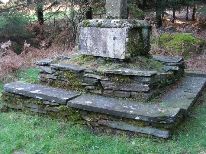 Emmarchement à deux degrés en schiste. Base carrée, fût chanfreiné et Chrit en croix en granite.