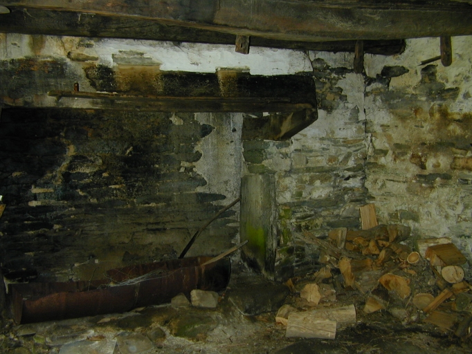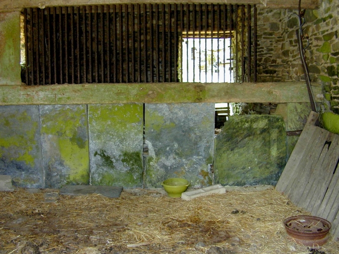 Logis à deux avancées, un à toit en bâtière, l'autre à toit rampant couvrant l'escalier extérieur de distribution. Sol couvert de dalles de schiste. Portes en plein cintre donnant accès au rez-de-chaussée et à l'étage. Délimitation des anciennes écuries en dalles de schiste.