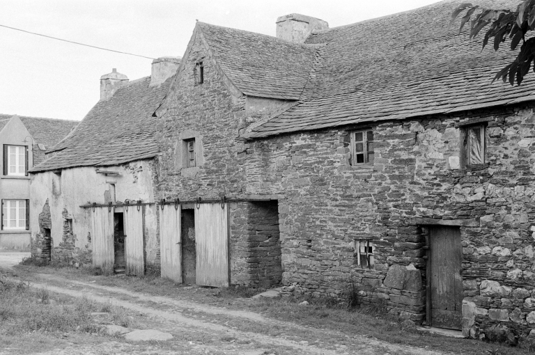 Logis à avancée construit en 1669 (date portée) et remanié en 1842 (date portée) lors du retournement de la façade. Date de 1784 gravée sur une pierre d'angle remployée. Partie ouest abritant les écuries au rez-de-chaussée et un logement à l'étage rajoutée en 1911. Le décor mural peint situé au-dessus de la porte nord, difficilement datable, semble dater du dernier quart du 18e siècle ; il représente des fleurs stylisés ainsi qu'une inscription aujourd'hui effacée mais connue par des photos anciennes et des archives, désignant les familles Caroff et Crenn, notables et marchands de toiles (juloded) comme propriétaires du lieu. Un autre logis semblable et sans doute contemporain formant un alignement a disparu après 1970.