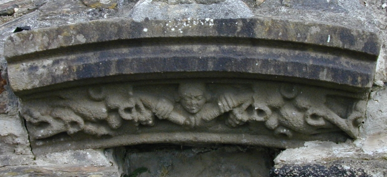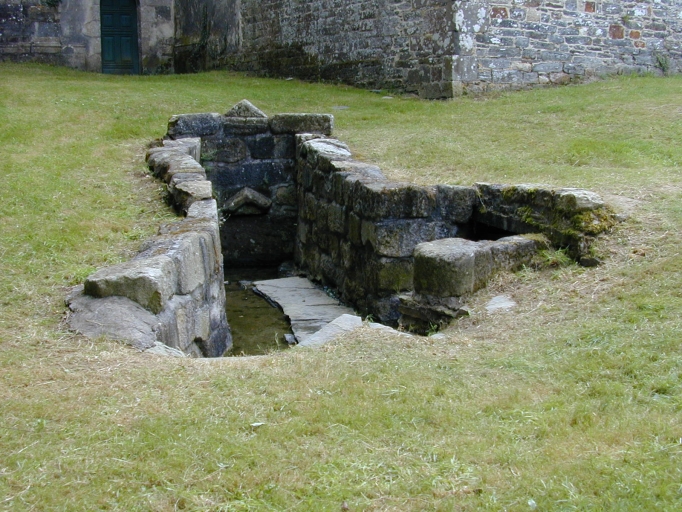 Fontaine sud-ouest avec remploi d'une frise sculptée en kersantite (personnage, décor stylisé).