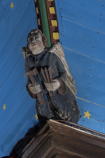 Buste, tête d'homme, anges (chevet). Armoiries Rohan (base du clocher).
