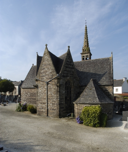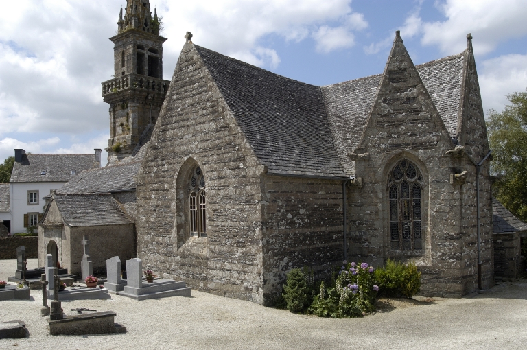L'emploi de matériaux différents correspond aux phases d'agrandissements ou de transformations de cet édifice hétérogène. Le recours à la microdiorite quartzique provenant du fond de la rade de Brest est peu fréquent dans ce secteur. L'architecte Théodore Boyer est également l'auteur des plans de reconstruction de l'église paroissiale de Saint-Rivoal. Site des Monts d'Arrée (site pluricommunal). Site Inscrit : Arrêté du 10/01/1966.