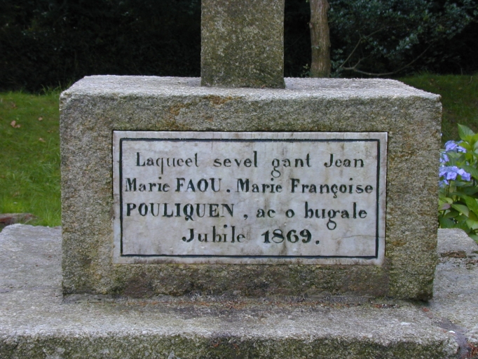 La croix a été réalisée en 1869 par le sculpteur Ian Larhantec à la demande de Jean-Marie Faou et Marie-Françoise Pouliquen et leurs enfants (inscription en breton). L'enclos maçonné est sans doute contemporain. Un ancien bénitier (?), élément rapporté, a été placé dans la partie ouest du placître. Cette croix monumentale remplace une croix plus ancienne marquée, à peu près au même endroit, sur le cadastre de 1812.