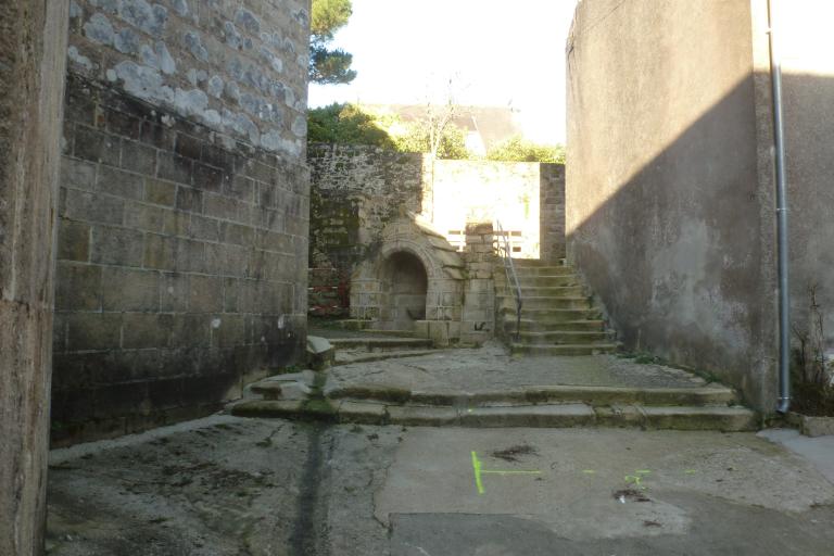La fontaine Saint-Raymond se trouvait à l’origine à environ 200 mètres au sud-ouest de l’église dédiée au saint éponyme à l’emplacement de l’actuelle école Sainte-Anne. Accompagnée de son lavoir, elle abritait la précieuse source Saint-Raymond qui, au moyen de conduites métalliques, venaient alimenter des bornes fontaines de la rue Double (actuelle rue Danton), de la Grand’rue (actuelles rues Laennec et Louis Pasteur) et la fontaine monumentale dressée sur le grand quai.
