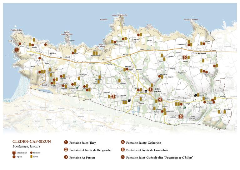 Cinq ouvrages font l’objet d’un dossier individuel : les fontaines Sainte-Catherine et Saint-They et les ensembles lavoir–fontaine de Kergaradec, Lamboban et Lanzulien (Saint-Guénolé). Certaines fontaines sont également traitées comme partie constituante de la chapelle ou de l’écart dont elles dépendent. (Fontaine de Langroas, lavoir de Théolen...).