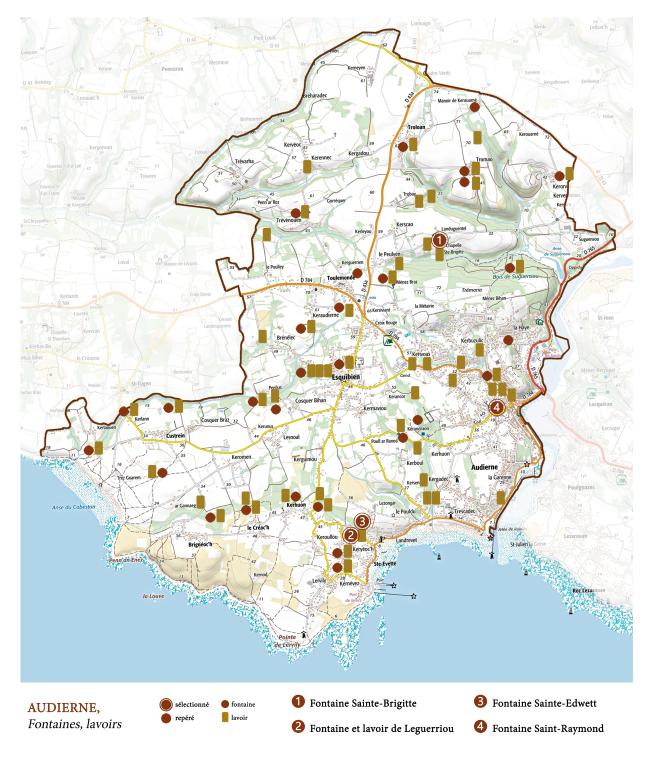 Cinq fontaines de dévotion ont été repérées. Elles sont dédiées à saint Onneau (deux fois), sainte Brigitte, sainte Edwett (commune historique d’Esquibien) et à saint Raymond (commune historique d’Audierne).