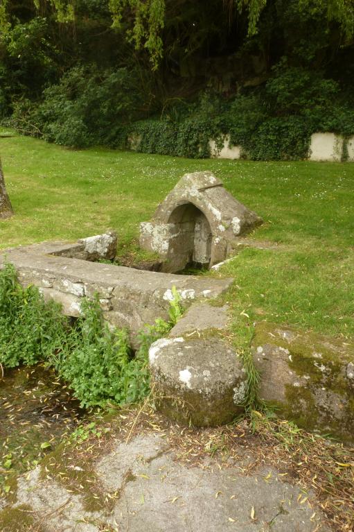 Les fontaines Sainte-Brigitte, Sainte-Edwett et Saint-Raymond sont associées à un édifice religieux (église ou chapelle). La première se trouve à Landugentel et porte la date de 1654, la seconde, datée de 1723, est isolée au nord du village de Landrevet, non loin du calvaire alors que la troisième, déplacée de son emplacement d’origine et portant trois fois la date de 1704, se dresse dans la ville d’Audierne à proximité de l’église Saint-Raymond. Toutes trois sont des édicules en pierre de taille, à bassin rectangulaire et niche à saint ménagée dans le mur pignon (pierre saillante pour la fontaine Saint-Raymond). Les dimensions importantes ainsi que les décors soignés de la fontaine Sainte-Brigitte en font un édicule tout à fait unique sur la commune.