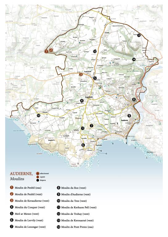 Des sept moulins à vent signalés dans les communes historiques d’Audierne et Esquibien sur le cadastre de 1837 seuls les moulins de Penbil (daté 1759) et de Keraudierne (daté 1810 et 1819) sont toujours visibles aujourd’hui, bien que ruiné pour le premier ou rehaussé et transformé en maison d’habitation pour le second.