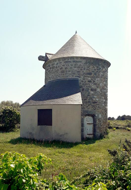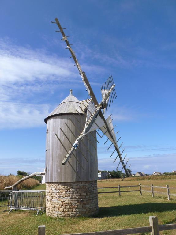 Les moulins à tour en pierre du Cap-Sizun ont un seul étage et sont plutôt bas. Le vent est omniprésent, on n’a donc pas besoin de le chercher en hauteur. Le toit, posé sur le fût, est tournant (bois sur bois avec beaucoup de graisse de cochon) et une « queue » (lostenn en breton) en chêne un peu courbée est aménagée de l’autre côté des ailes.
