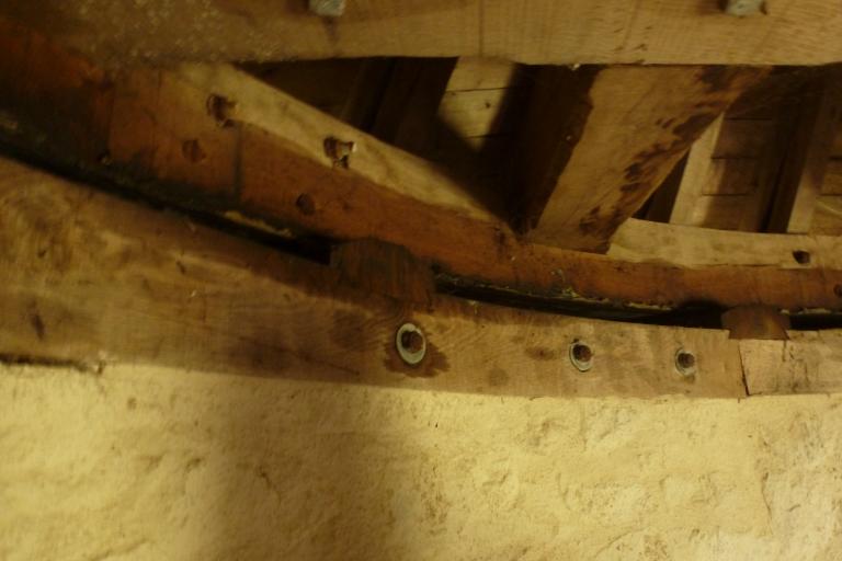 Le mécanisme se trouve à l’étage. La majeure partie des éléments est en chêne (chemins dormant et tournant, bras, lanterne, rouet, etc…) mais les dents du rouet et les fuseaux de la lanterne étaient faits en bois plus dur comme le cormier.
