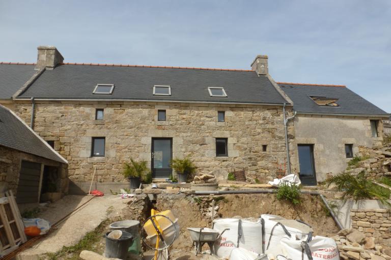 Le moellon est utilisé pour le gros œuvre (pignons, élévation postérieure, dépendances) et l’usage de la pierre de taille est généralement limité aux chainages d’angles, bandeaux, corniche du toit, souches de cheminées et encadrement des baies. L’usage du moellon enduit était majoritaire sur les façades antérieures des logis, mais il arrivait, sur certaines fermes à logis à étage, que ce soit la pierre de taille qui soit employée (Lezanquel, Trouguennour, Kernot, etc.)