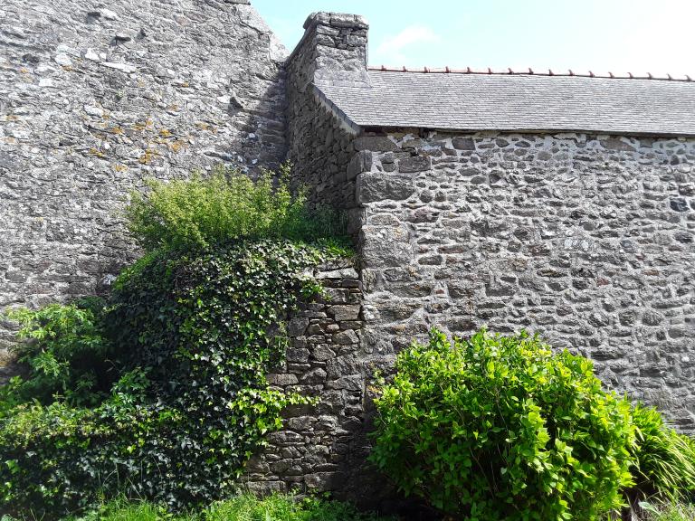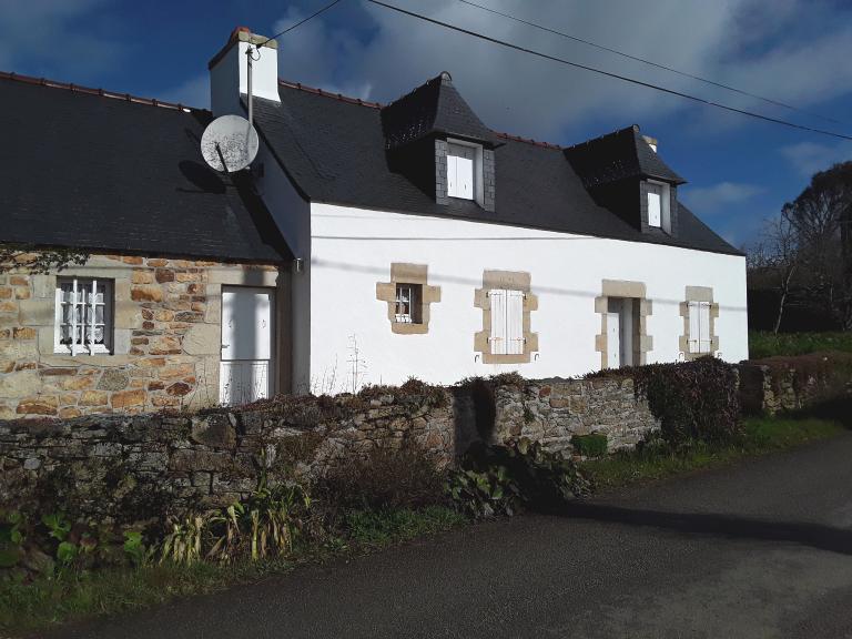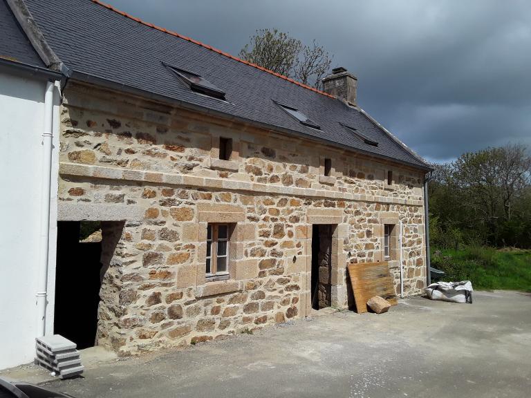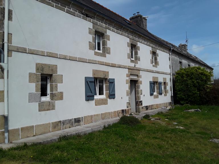 Le moellon est utilisé pour le gros œuvre (pignons, élévation postérieure, dépendances) et l’usage de la pierre de taille est généralement limité aux chainages d’angles, bandeaux, corniche du toit, souches de cheminées et encadrement des baies. L’usage du moellon enduit était majoritaire sur les façades antérieures des logis, mais il arrivait, dans certains rares cas de fermes à étage principalement situées au sud de la commune, que ce soit la pierre de taille qui soit employée (Trevern, Kergonvan, etc...).