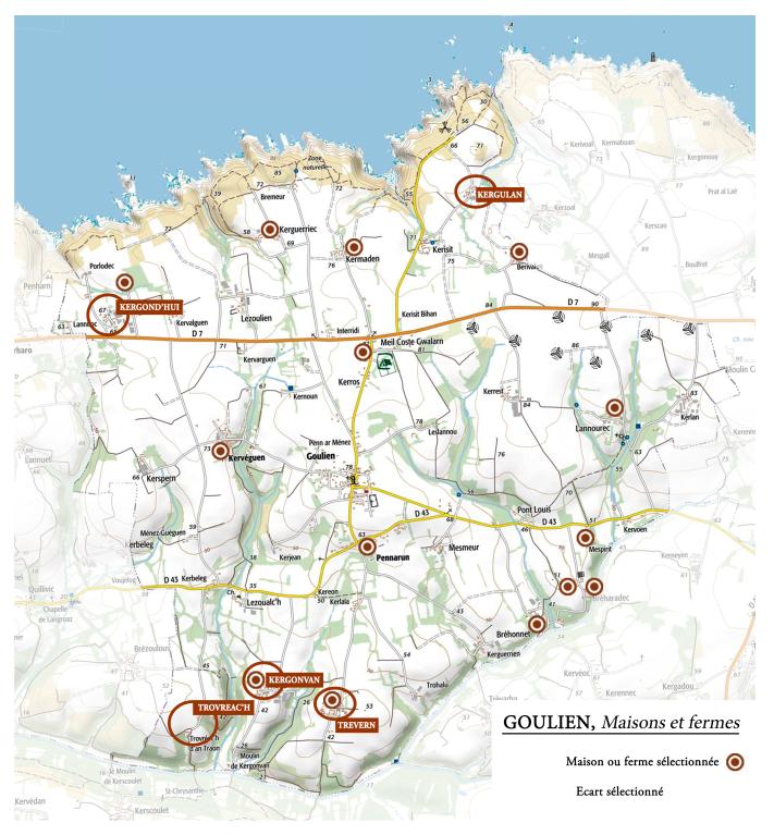 L’élévation à trois travées est le type le plus fréquent à Goulien, environ la moitié des maisons à étage de la commune présente cette façade : trois fenêtres sont ouvertes à l’étage au-dessus de la porte d’entrée et des deux fenêtres qui l’encadrent. L’élévation à cinq travées est plus rare et semble être réservée aux fermes les plus importantes (Kerguerrien, Trevern, Trovreac’h d’an Traon…). Attention cependant aux modifications des façades destinées à amener plus de lumière : une ferme de Trevern, par exemple, s’est vue gagner deux travées lors d’une récente restauration.