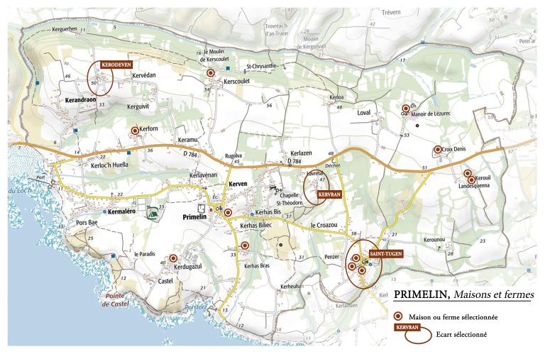 Les villages plus importants, qui comportaient une dizaine de feux ne sont pas en reste : Kerscoulet, Kerandraon ou Kermalero. Mais la singularité de Primelin réside dans la présence d’une ancienne trêve : Saint-Tugen qui en 1837 abritait trois fois plus d’habitations que le bourg lui-même : 9 feux au bourg contre 27 à Saint-Tugen. Cette trêve n’est pas devenue commune à part entière mais reste le village le plus important de Primelin.