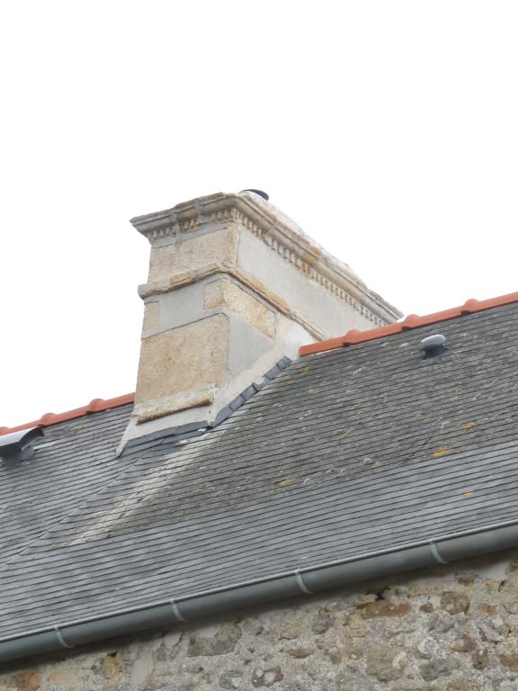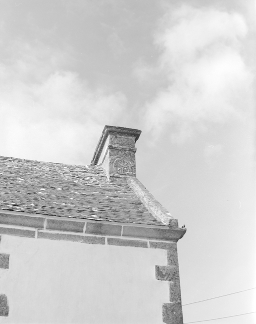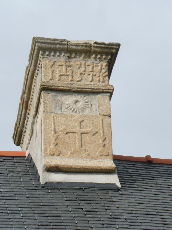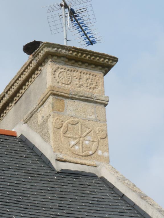 Les souches de cheminées observées sur la commune, quant à elles, proposent deux types de décors : les plus anciennes sont terminées par une corniche moulurée en « talon renversé » alors qu’à partir de la seconde moitié du 19e siècle, celles-ci sont chanfreinées. Au sud de Kerlazen, on peut observer une ornementation exceptionnelle des souches de cheminées du logis d’une ferme. Ici, en plus de la date de 1775, ont été sculptés une croix flanquée de deux chandeliers ainsi que plusieurs rosaces et le sigle IHS.