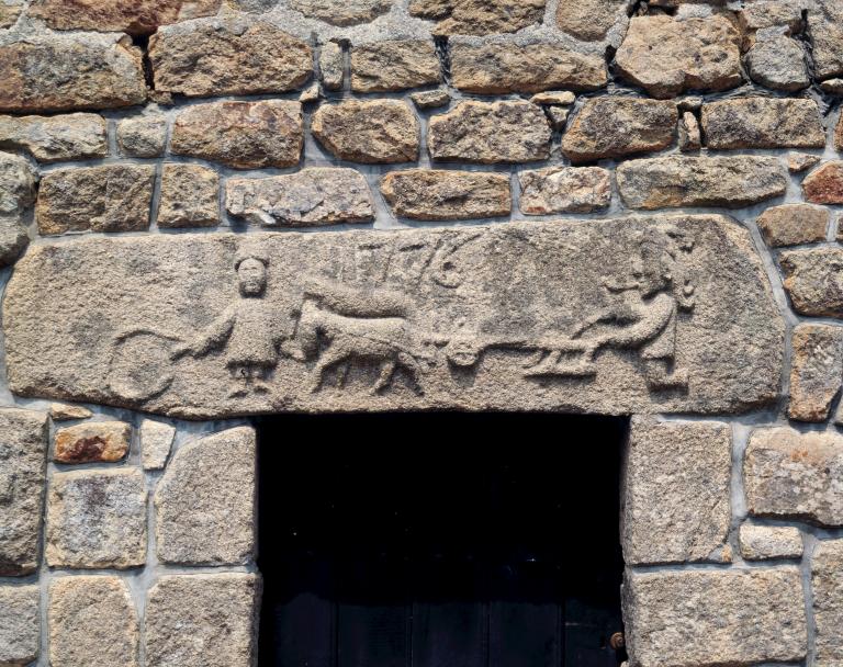 Signalons également l’étonnante et unique scène de labour, datée 1776, sculptée sur le linteau de l’écurie de la ferme de Kerounou ainsi que les deux visages représentés au-dessus d’une porte à Kerhas Bras.