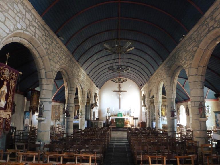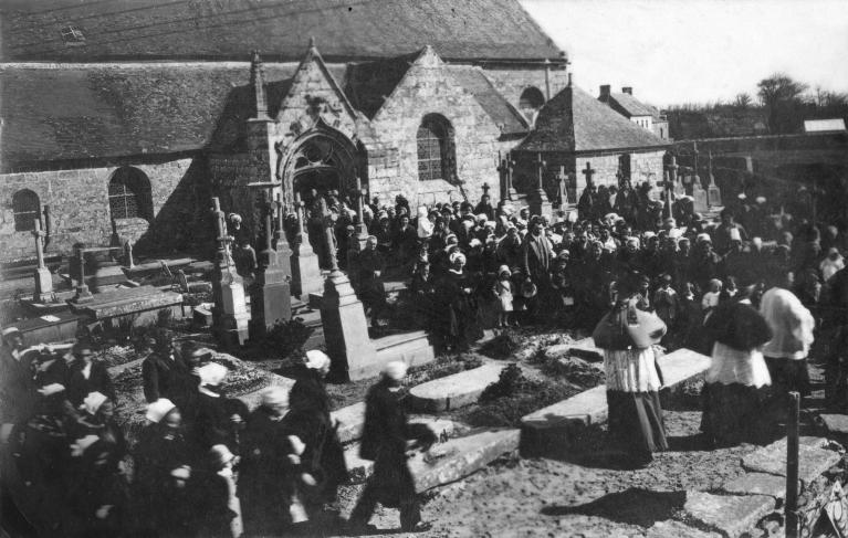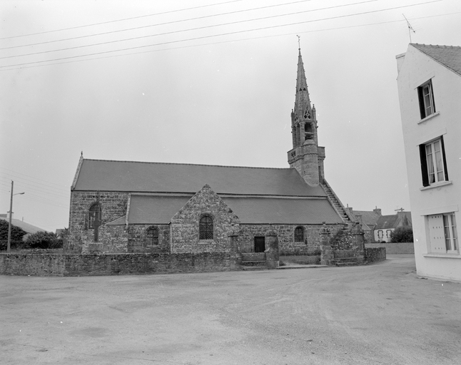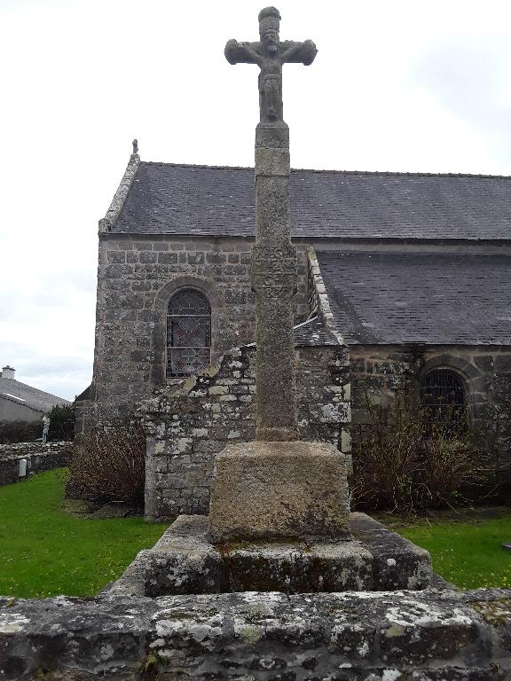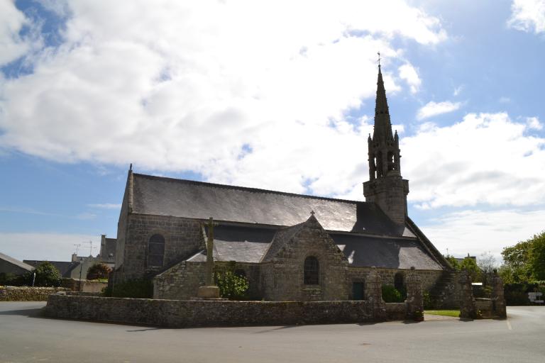 Nef 1ère moitié 16e siècle, clocher 16e siècle provenant de la chapelle de Lo Christ en Beuzec-Cap-Sizun ; baies probablement refaites au 18e siècle ; date de 17 (3, ?) 8 à l' angle nord-est du porche sud ; nombreuses inscriptions illisibles souvent en remploi ; croix de l' enclos datée 1827 ; inscription : YES GEN MIE ANE GGE ; stèle préhistorique.