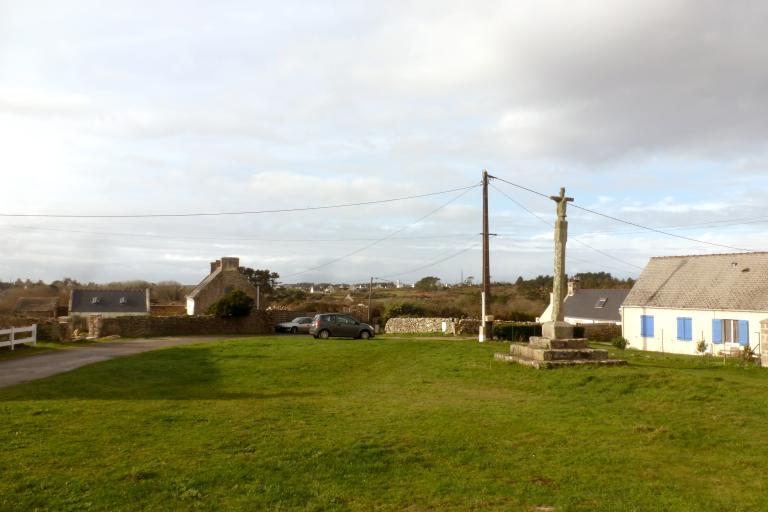 L’inscription « P CARN R F.P.C.Y. DE LANDRER 1816 » que l’on peut déchiffrer sur la base du croisillon donne quelques renseignements sur les origines de la croix de Kergroas : Commanditée par Pierre CARN, recteur de Plogoff entre 1814 et 1818, elle a été érigée en 1816 probablement par un certain C.Y. du village voisin de Landrer.