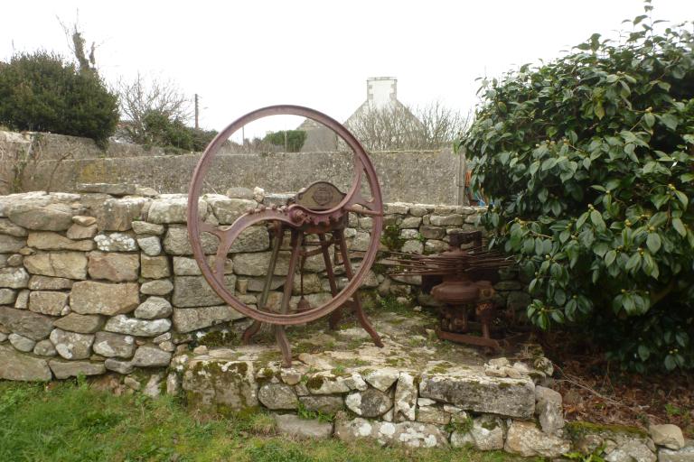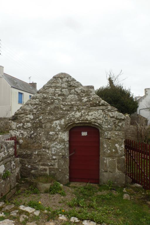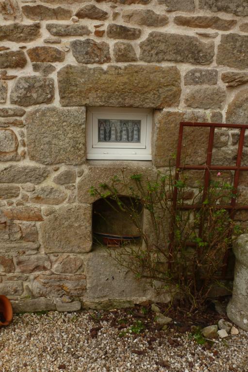 Le four à pain se trouve le long de la départementale, tout au nord de la parcelle, intégré au muret qui clos la propriété. Il est du type que l’on retrouve à Pendreff ou à Keriolet en Cléden-Cap-Sizun avec une maçonnerie en moellons irréguliers et toit en terre. Ici, la porte en anse de panier réemployée se trouve sur le pignon ouest. Contrairement aux « ti forn » dépendants d’une ferme en particulier, ces fours étaient communs à toutes les familles du village.