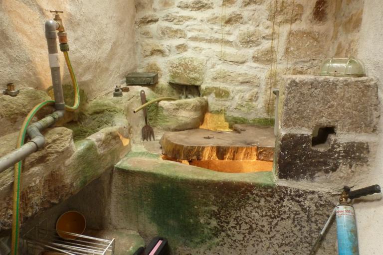 Un premier canal, dont l’amorce est aménagée dans le mur est de la dépendance, alimente une auge destinée aux chevaux située contre le mur nord du logis. Un deuxième canal débute par une pierre creuse intégrée au mur nord de la dépendance, puis suit un chemin aménagé contre le pignon ouest et une partie de la façade sud du logis. L’eau est alors guidée soit vers un évier intérieur intégré au pignon ouest, soit vers une auge destinée aux vaches située contre la façade sud.
