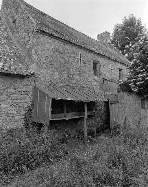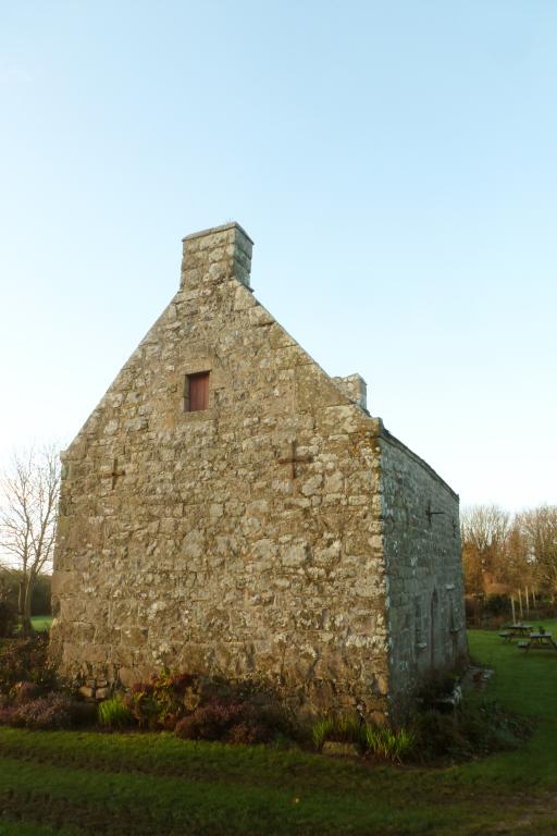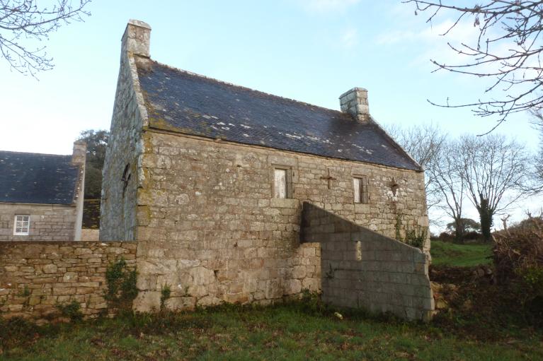 Notons que des réemplois sont visibles à l’intérieur comme à l’extérieur du bâtiment. La cheminée proviendrait de l’ancien manoir de Kerouil. (Une cheminée du même type se trouve à l’étage de l’écurie de la ferme) et les pierres disposées au sol, contre la façade nord, seraient le seul vestige de l’ancien moulin à vent qui se trouvait à quelques centaines de mètres au sud.
