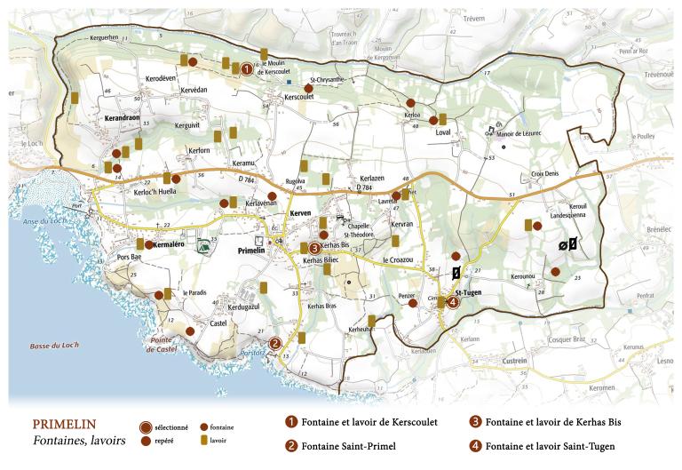 Quatre fontaines dont trois sont associées à un lavoir font l’objet d’un dossier individuel : les fontaines Saint-Primel, Saint-Tugen, de Kerhas Bis et de Kerscoulet. La fontaine Saint-Chrysanthe est étudiée dans le dossier traitant de la chapelle du même nom.